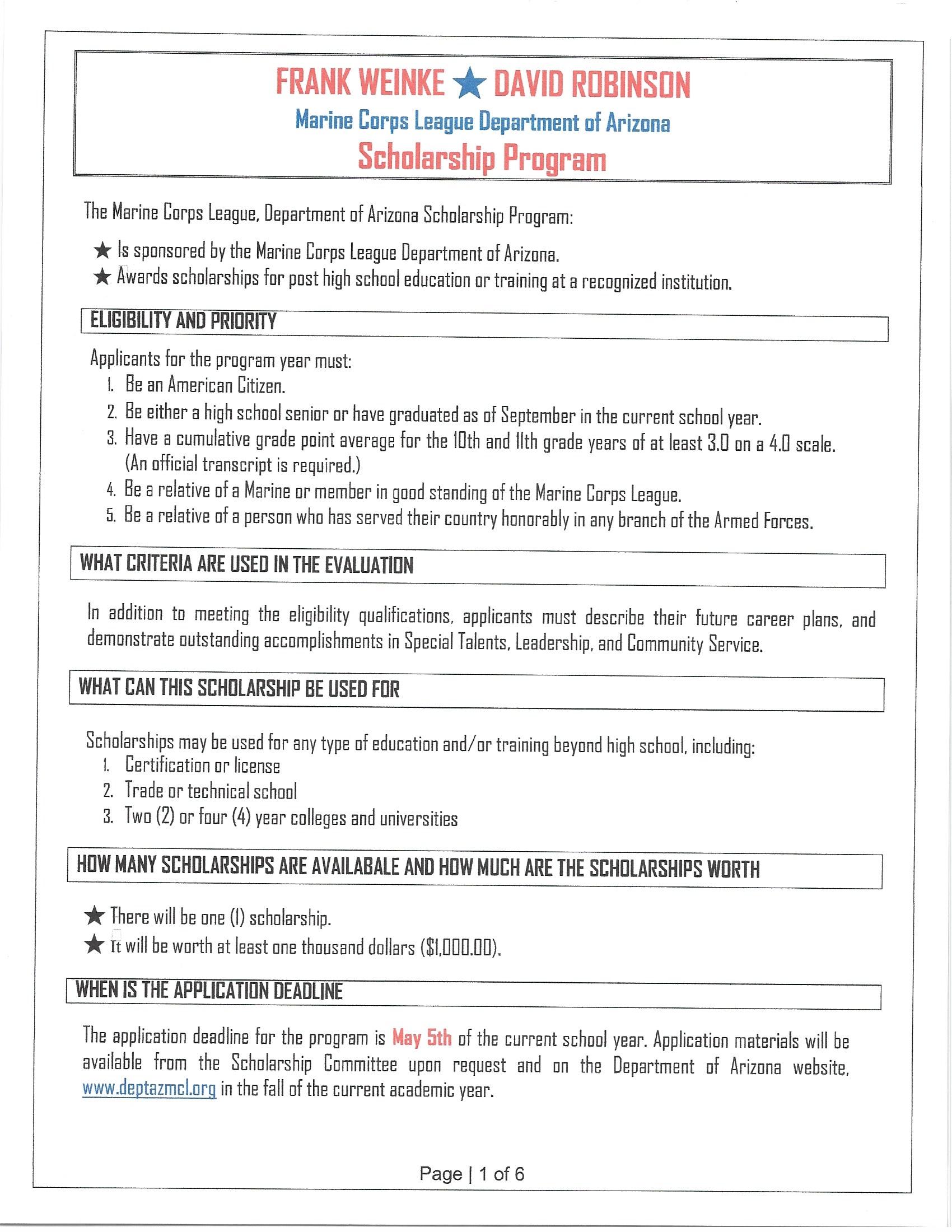 In addition to the Department of Arizona scholarship, the Marine Corps League offers a national scholarship funded by the Marine Corps League Foundation. Eligible applicants are encouraged to apply for both programs to maximize their opportunity for funding.